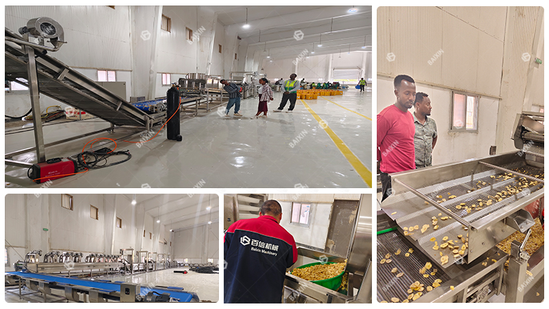 In July 2025, the technical team from Baixin Machinery's Overseas Engineering Department went to the project site in Ethiopia and, after 10 days of rigorous construction and system debugging , successfully delivered a 300kg/h plantain chip processing production line . Currently, the entire production line is operating stably, the product quality has met the expected standards, and it has officially entered the production stage .