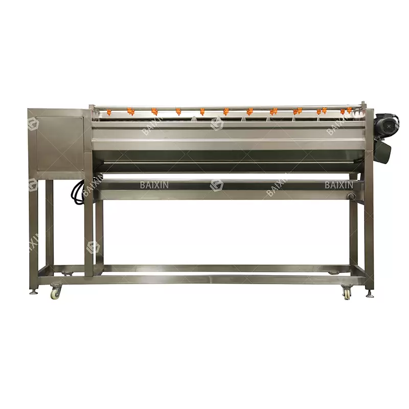 Freshly cut French fries immediately pass through a bubble washing machine. The tumbling of bubbles and the circulation of water in the washing tank thoroughly agitate the fries, deeply removing impurities and starch, thus preventing them from sticking together during subsequent processing.