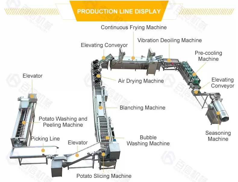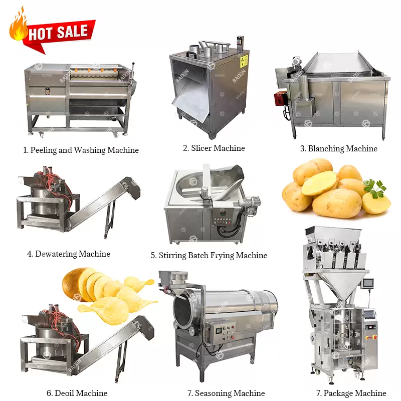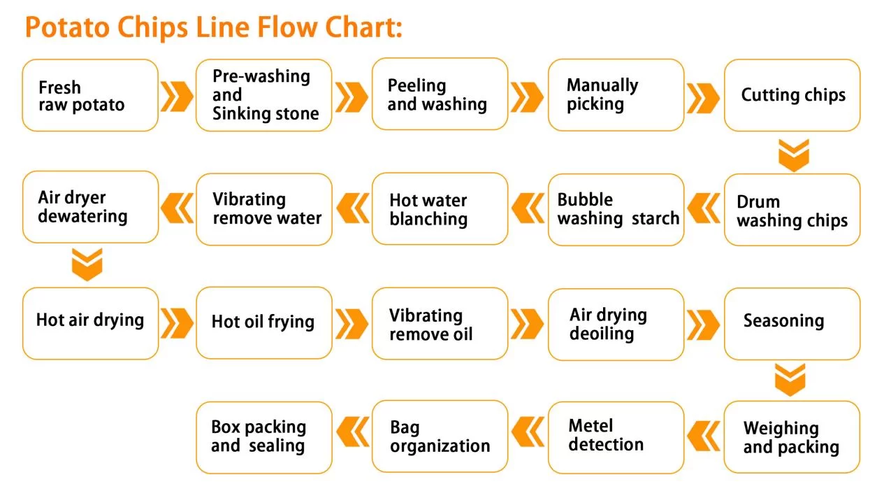 Configuration: Water bucket elevator - Spiral washing and peeling machine - Sorting table - Slicing - Water bucket elevator - Blanching machine - Vibrating dewatering machine - Hot air dryer - Frying Machine - Vibrating deoiling machine - Seasoning machine - Packaging machine