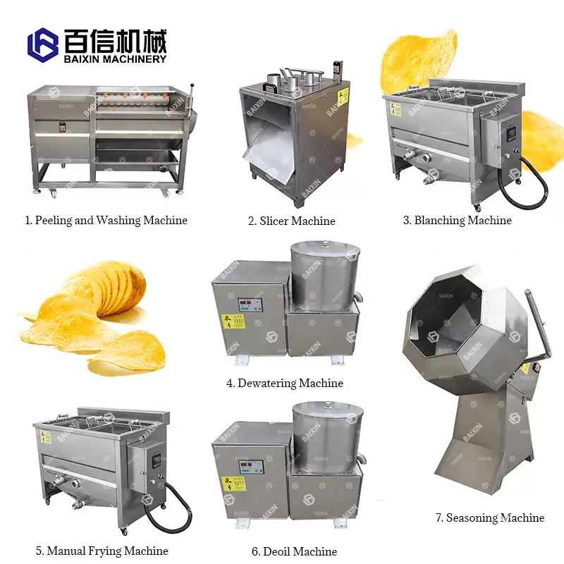 Core Components: Washing and peeling machine - Slicing machine - Blanching machine - Dehydrator - Manual frying machine- Oil extractor - Seasoning machine - Packaging machine