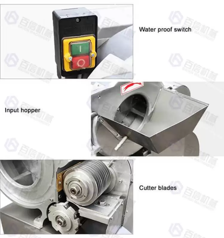 2.It can be material into different size cubes by changing the different blade units, such as 3*3*3mm, 5*5*5mm, 10*10*10mm, 15*15*15mm, 20*20*20mm and so on.