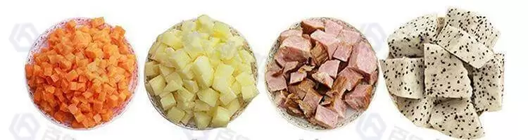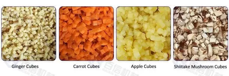 1.This industrial electric dicing machine can cut potatoes, sweet potatoes, carrots, cucumbers, balsam pear, lotus root, eggplant, tomato, onion, shiitake mushroom, apple, pineapple, mango, cheese, etc., into cube shape perfectly.