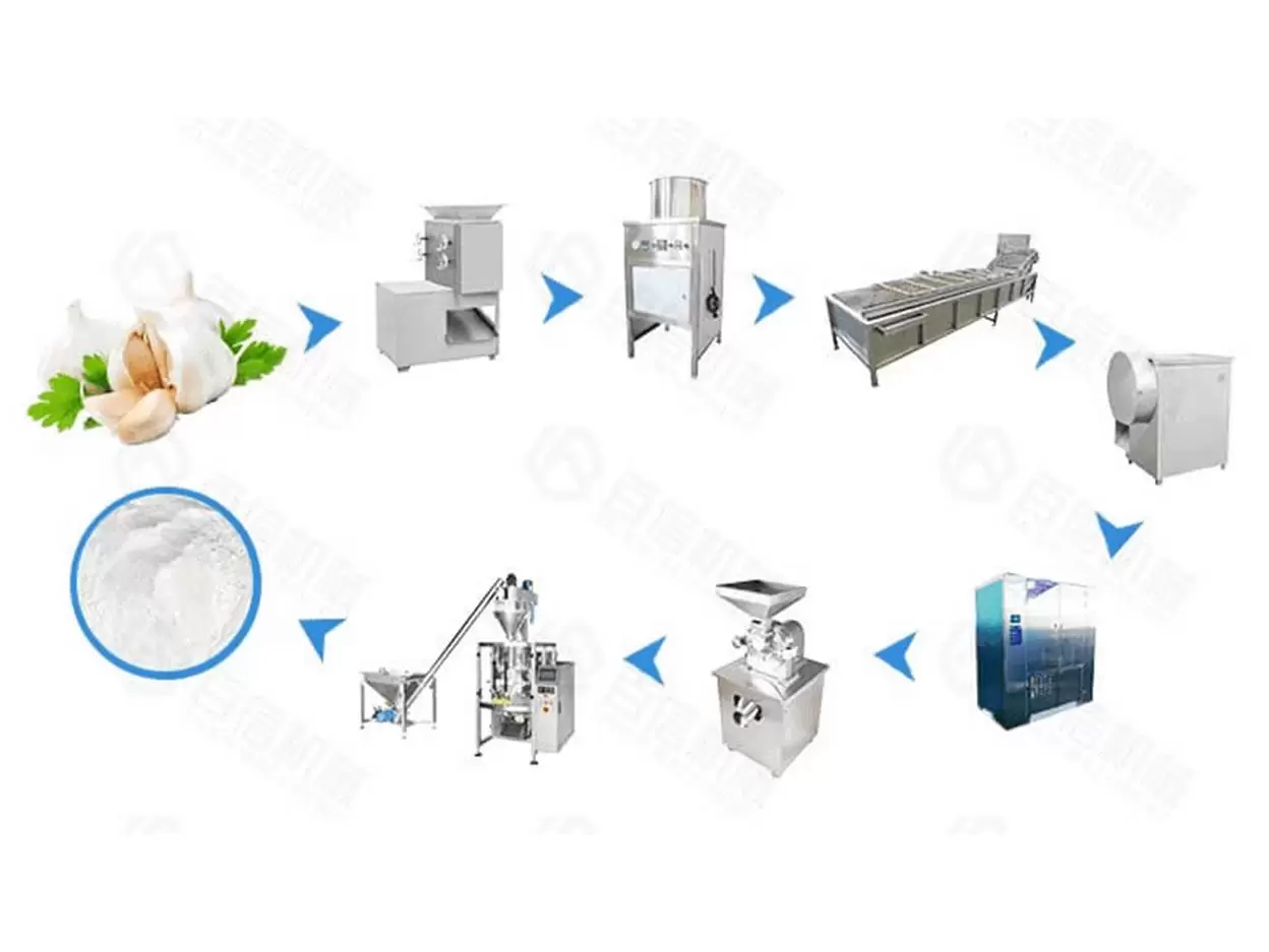 The garlic powder processing line has fast processing speed, and good quality. It includes garlic clove separator, garlic peeling machine, garlic washing machine, garlic slicer, air dryer, garlic dryer, garlic grinder, garlic powder packaging machine, and other equipment, which can be used for deep processing of garlic dehydration slices, garlic powder, etc. . The production line adopts advanced technology, and direct sales at factory prices. This is the best choice for the garlic powder business and the most ideal equipment for garlic processing at present.